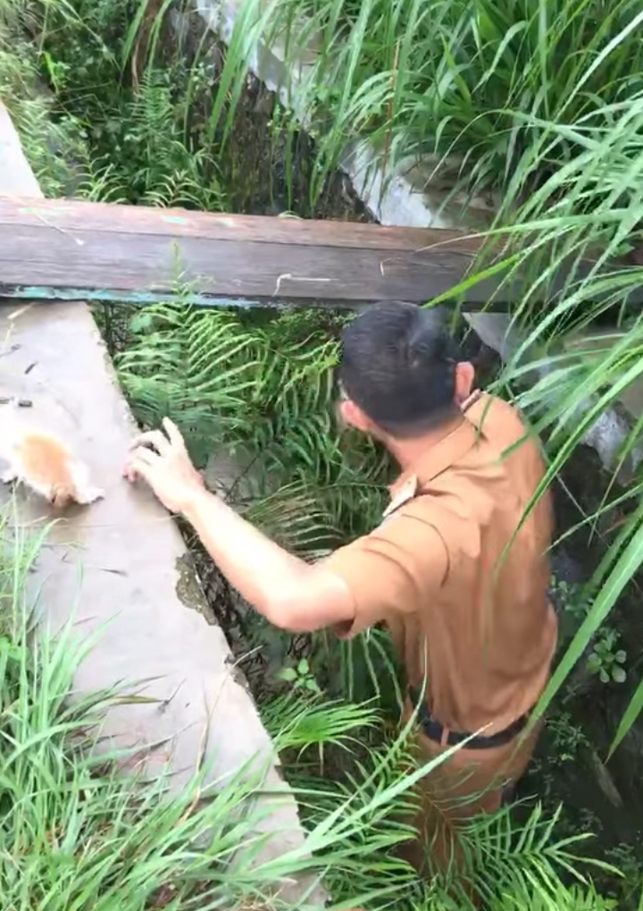 Dalam video yang beredar di media sosial, terlihat sang camat langsung turun ke selokan, lalu perlahan-lahan mengangkat kucing kecil berwarna oranye-putih yang tampak ketakutan. Aksi tersebut langsung mengundang decak kagum warga sekitar dan netizen.